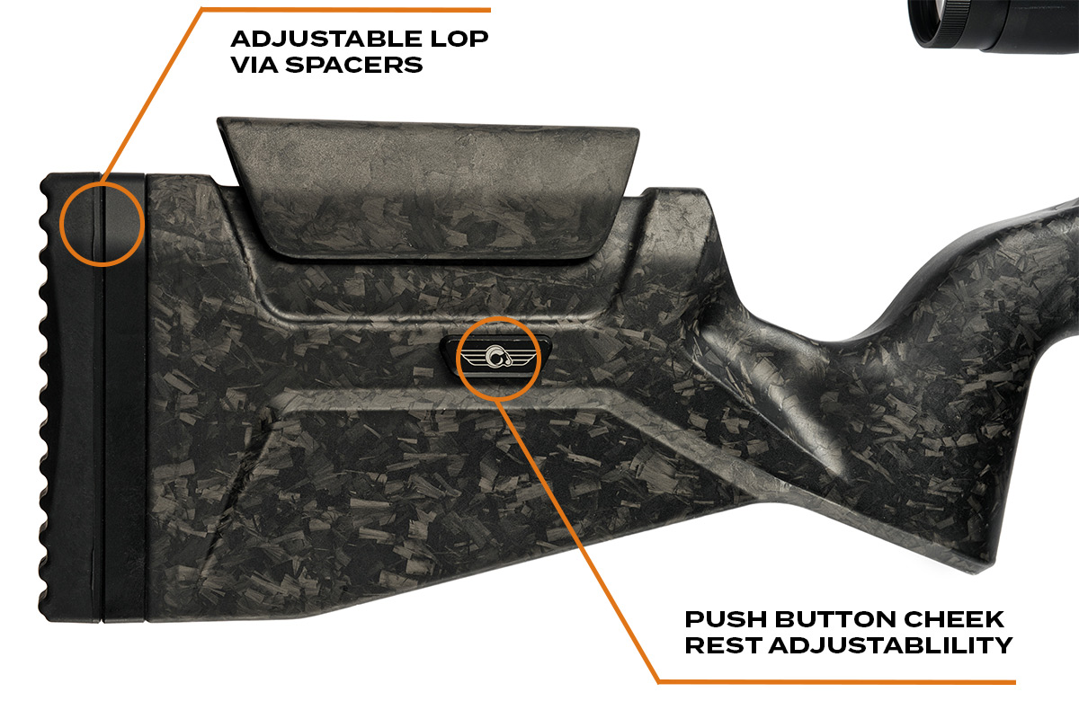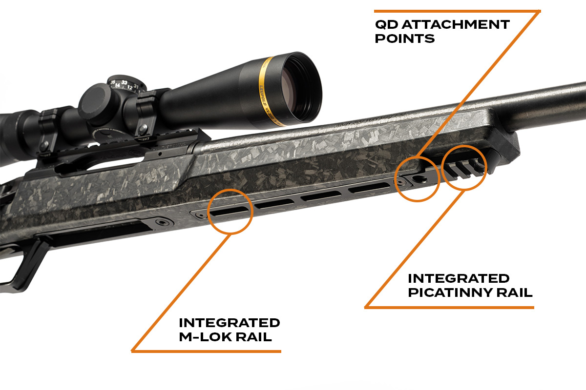 Starting with a lightweight yet incredibly durable FFT™ carbon fiber stock, the Modern Carbon Rifle features an adjustable push-button FFT™ cheek riser, adjustable length of pull (via spacers), full-length M-LOK™ on the forearm, front and rear QD attachment points, and an integrated forward Picatinny rail section.