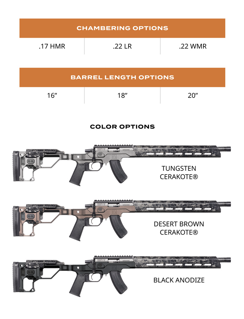 The Modern Precision Rifle Rimfire is available in 3 lengths (16, 18 and 20 in.), 3 colors and 3 chamberings: 22LR, 22WMR, and 17HMR.