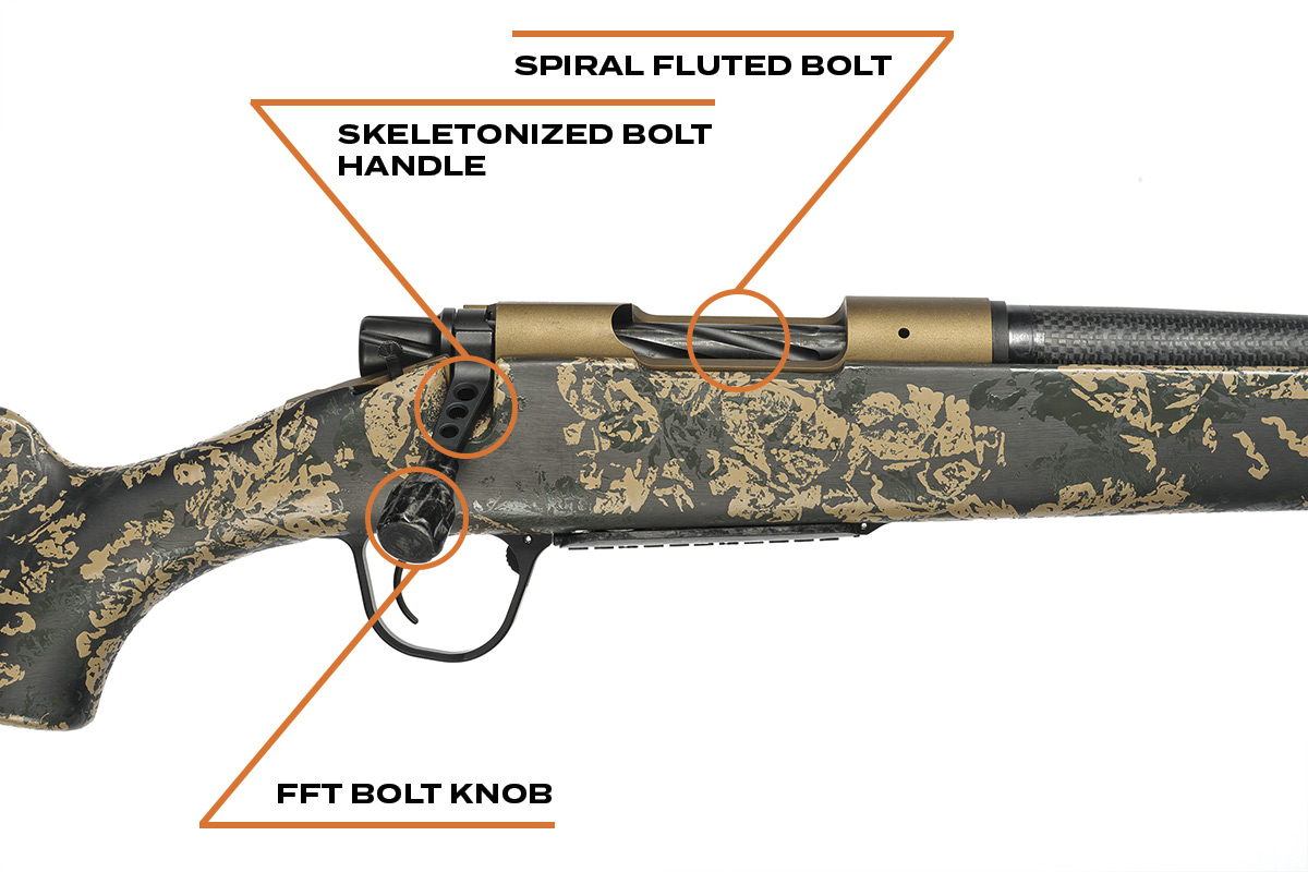 The Ridgeline FFT includes a spiral fluted bolt that rides on an internal anti-bind rail for stability. The bolt also features a black nitride coating, M16-style extractor, and dual ejectors for magnum calibers.